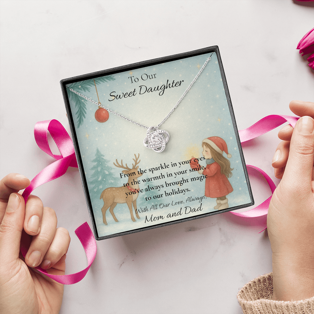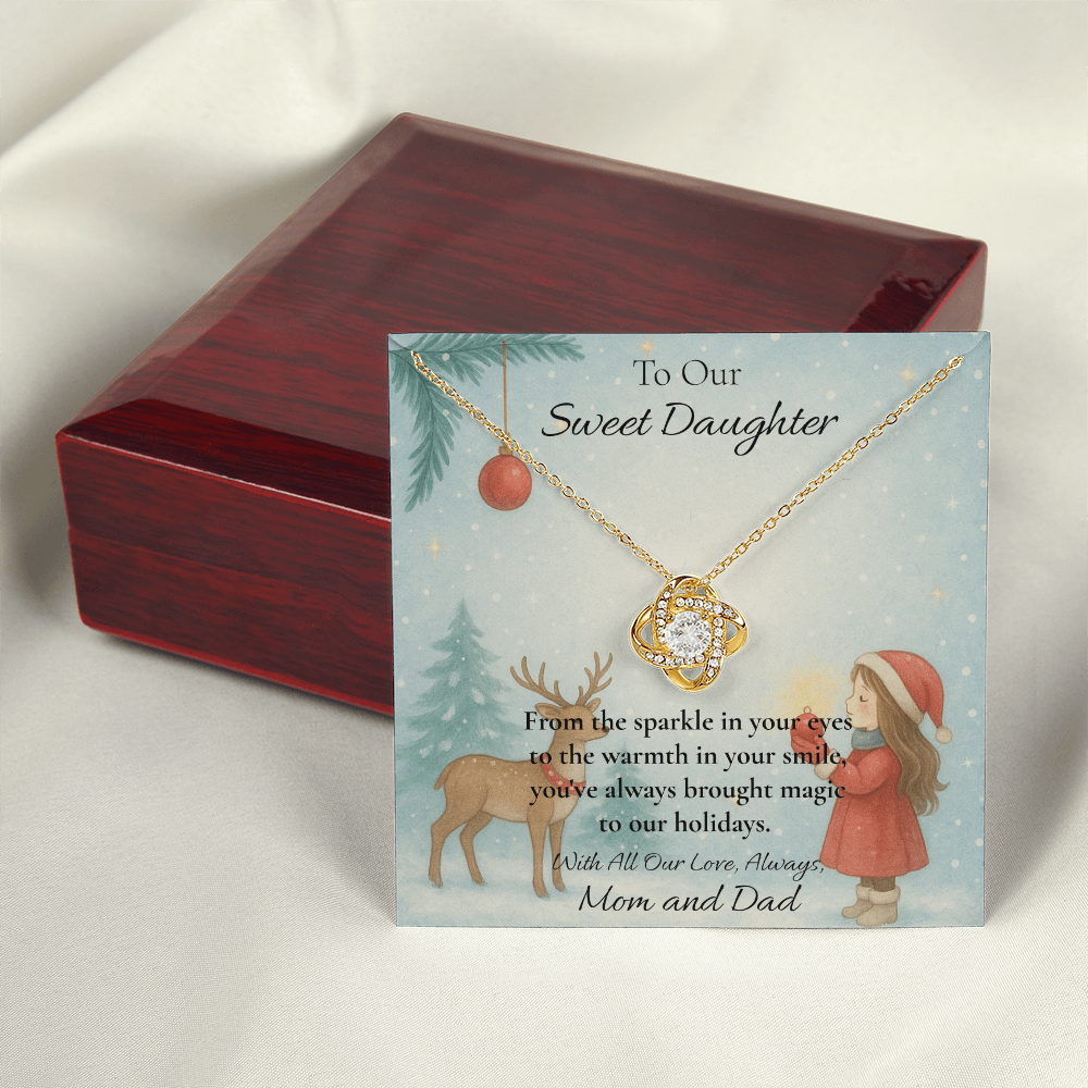 Your daughter has always been the light of your life—and now, this Christmas, you can remind her just how much she means to you with a gift that captures the warmth of your love. Featuring a stunning Love Knot Necklace and a beautifully illustrated message card, this keepsake is made to melt hearts.